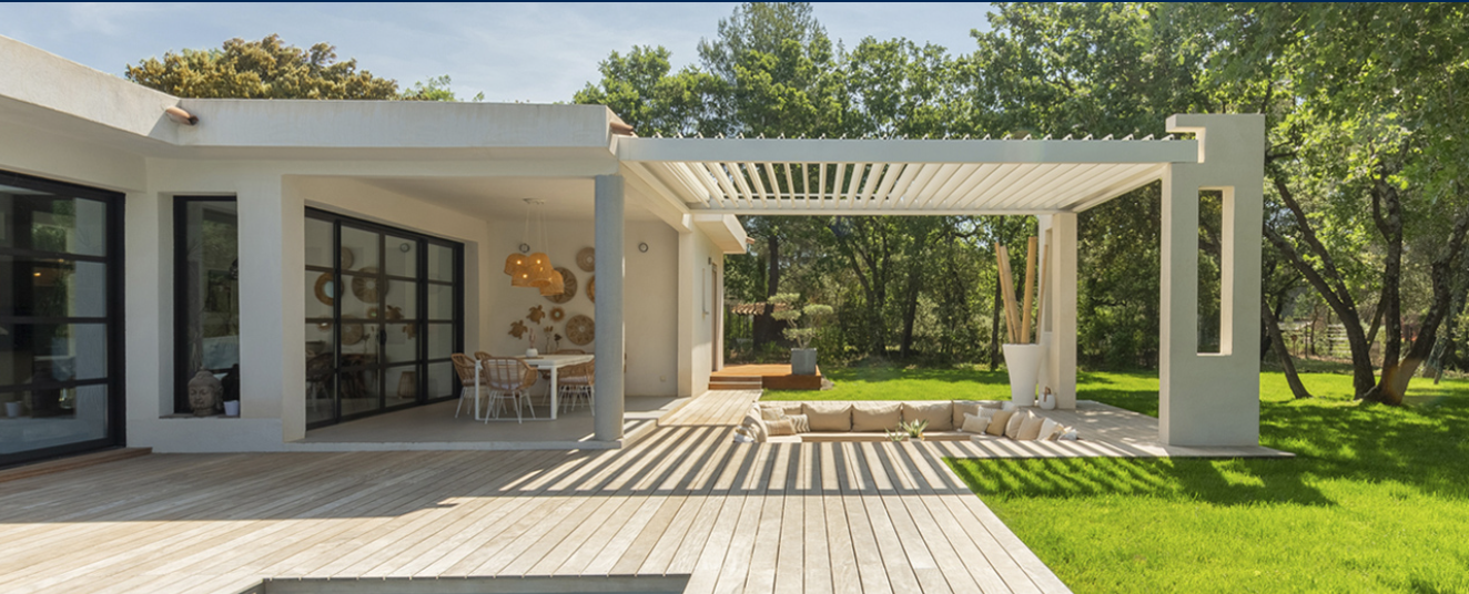 Estilo ligero y versátil. Pérgola adaptable a todo tipo de viviendas, con techo orientable y estructura acoplable hasta 6 × 6 m sin columna central.